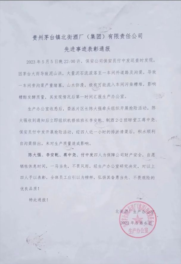 2023年5月5日夜晚,我市遭遇强对流天气,突如其来的暴雨,为保安值守工作增加了诸多风险与考验,公司派驻北街酒厂的保安员付中发,面对暴雨给客户单位排水沟渠造成的堵塞,第一时间发现,第一时间疏通,为客户单位避免了较大经济损失。